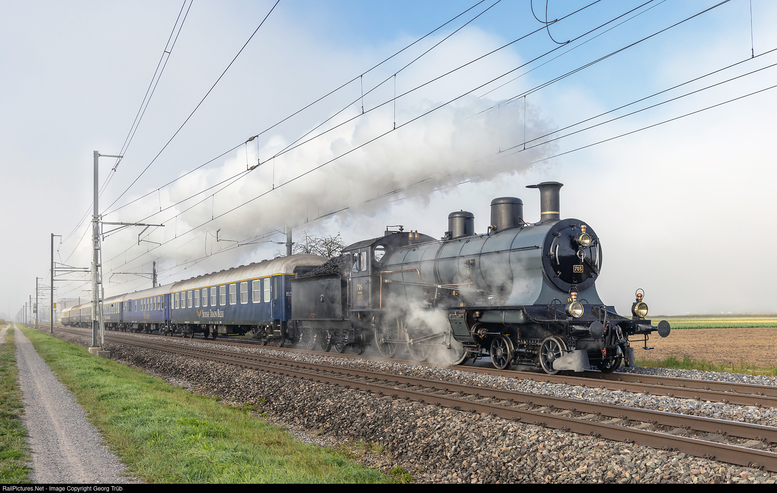 | Fourcylinder compound express train steamlocomotive A 3/5 # 705 of SBB Historic, maintained and operated by Verein Dampfgruppe Zürich (VDZ), is coming out of the morning mist between Hüntwangen-Wil and Rafz, with the SUISSE TRAIN BLEU 32817 from Brugg AG via Regensdorf-Bülach to Schaffhausen-Singen (Hohentwiel)/Germany-Ramsen-Etzwilen. |