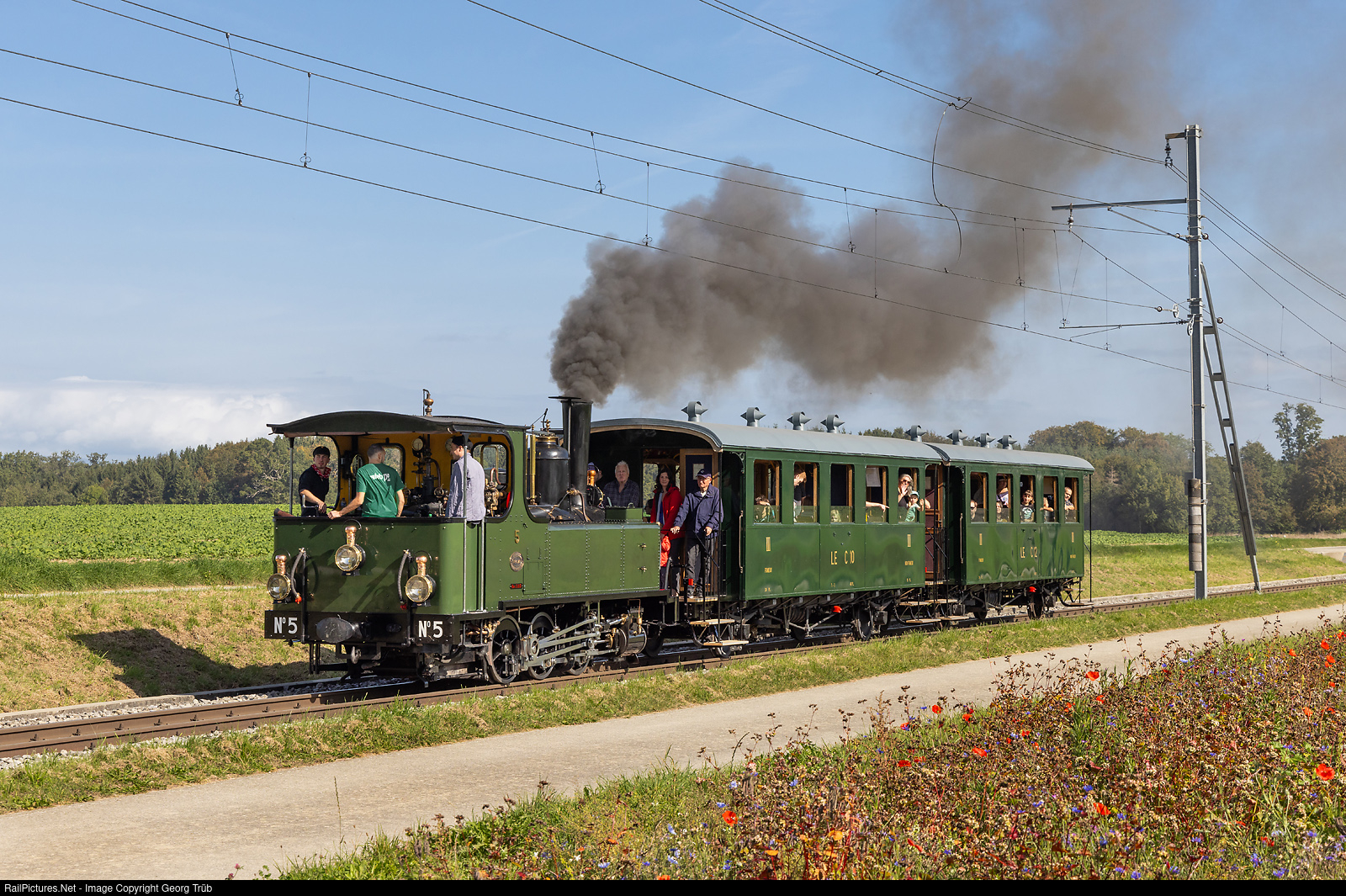 For the 150th anniversary (1873 to 2023), the meter gauge Lausanne-Echallens-Bercher Railway invited as guest locomotive the G 3/3 # 5 of the Blonay Chamby Museum Railway. Together with the two own passenger cars C # 12 and C # 10 a nice train could be formed, which ran three times between Echallens and Bercher on both days of the weekend September 30th/October 1st. The first train is leaving Sugnens back to Echallens. The steamlocomotive was built in 1890 by the Alsatian Mechanical Engineering Company (EMBG) in Grafenstaden for the Lausanne-Echallens-Bercher Railway (LEB) and is owned by the Blonay-Chamby Railroad Museum since 1973, operational since 1985.