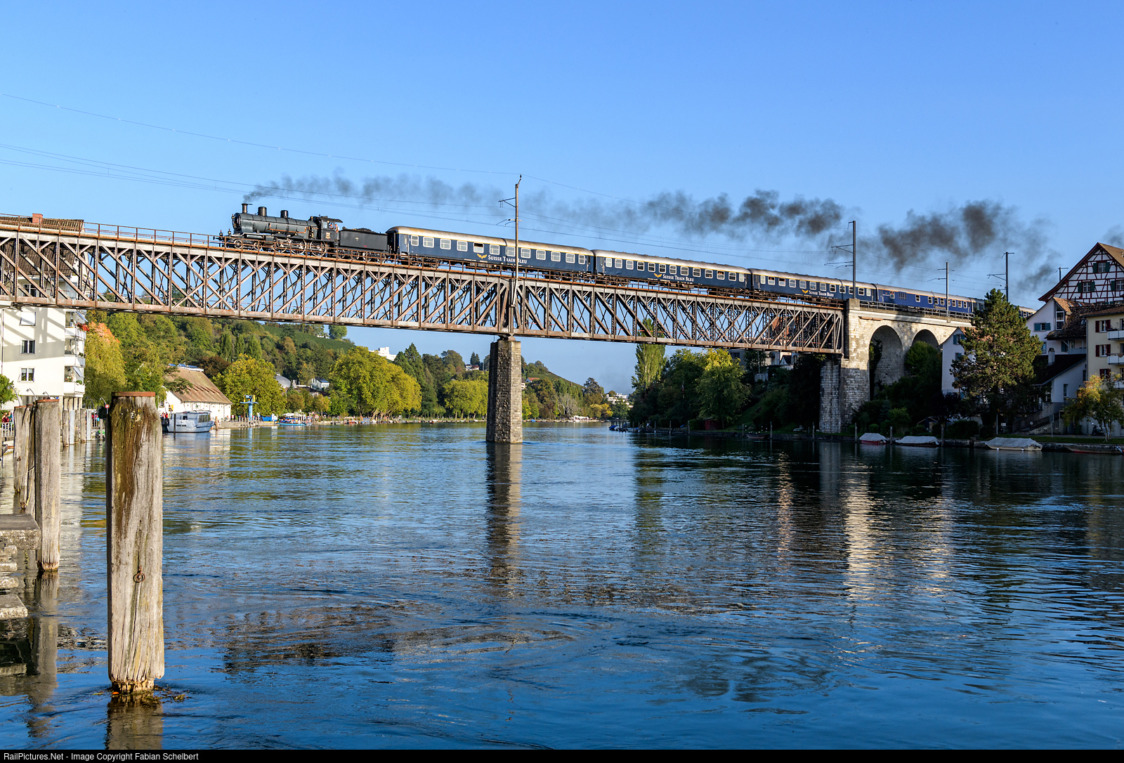 | SBB Historic's A 3/5 #705 was in operation on 1 October 2023 with the Suisse Train Bleu on the non-electrified line between Singen (Germany) and Etzwilen (Switzerland). On the way back, this photo was taken on the bridge over the Rhine before Schaffhausen. The locomotive is maintained and operated as a permanent loan by the Verein Dampfgruppe Zürich (VDZ). |