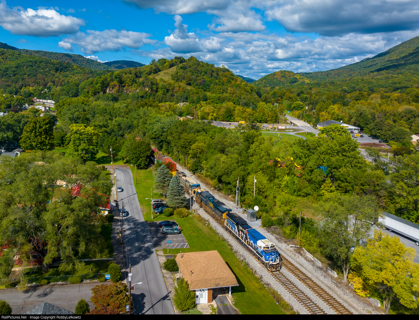 CSXT 3194 heads eastbound through downtown Hyndman, PA, as it reaches the final stretch of its journey on the Keystone Subdivision before reaching Cumberland |