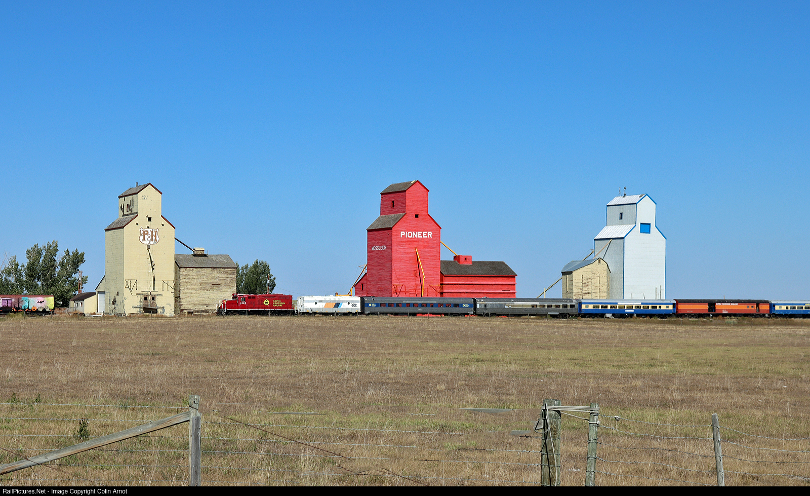 The aspen Crossing Sunday Brunch excursion makes it's way past the Mossleigh grain elevators.
