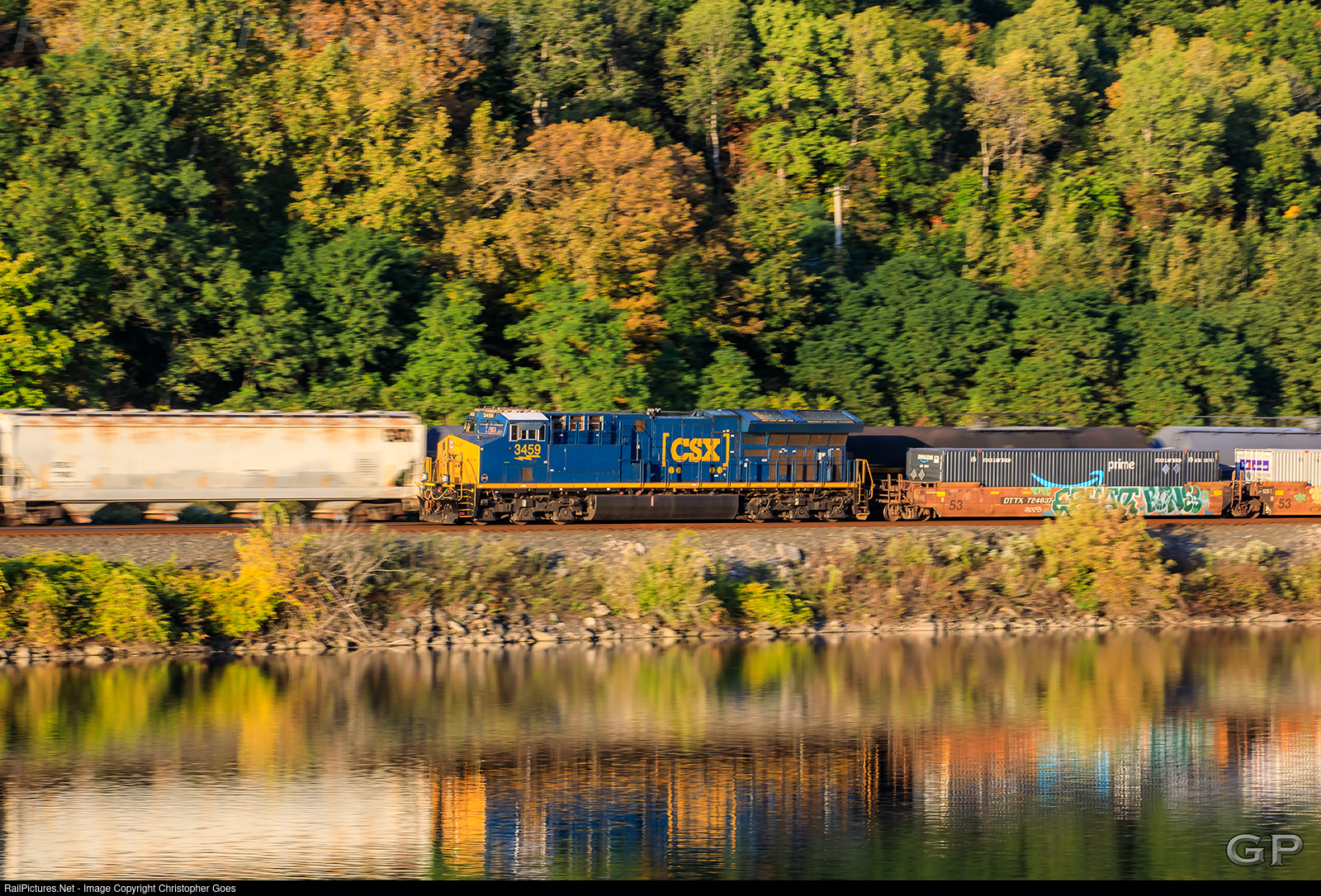 | With fall foliage at its beginning in Upstate NY, CSX 3459 glides along the Mohawk river at Erie Canal Lock 10 pushing an eastbound intermodal as the rear DPU reflecting on the water passing the westbound M627 during the golden hour. |