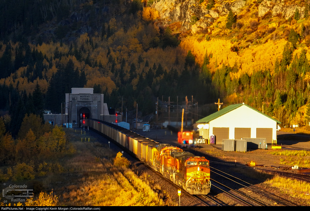 | It is 7:22am and the valley in which the Moffat Tunnel is located is half lit by the rising sun. A trio of BNSF DPUs brings up the tail end of a westbound coal train, which is disappearing in to the 6.2 mile long Moffat Tunnel amidst some fantastic fall colors. |