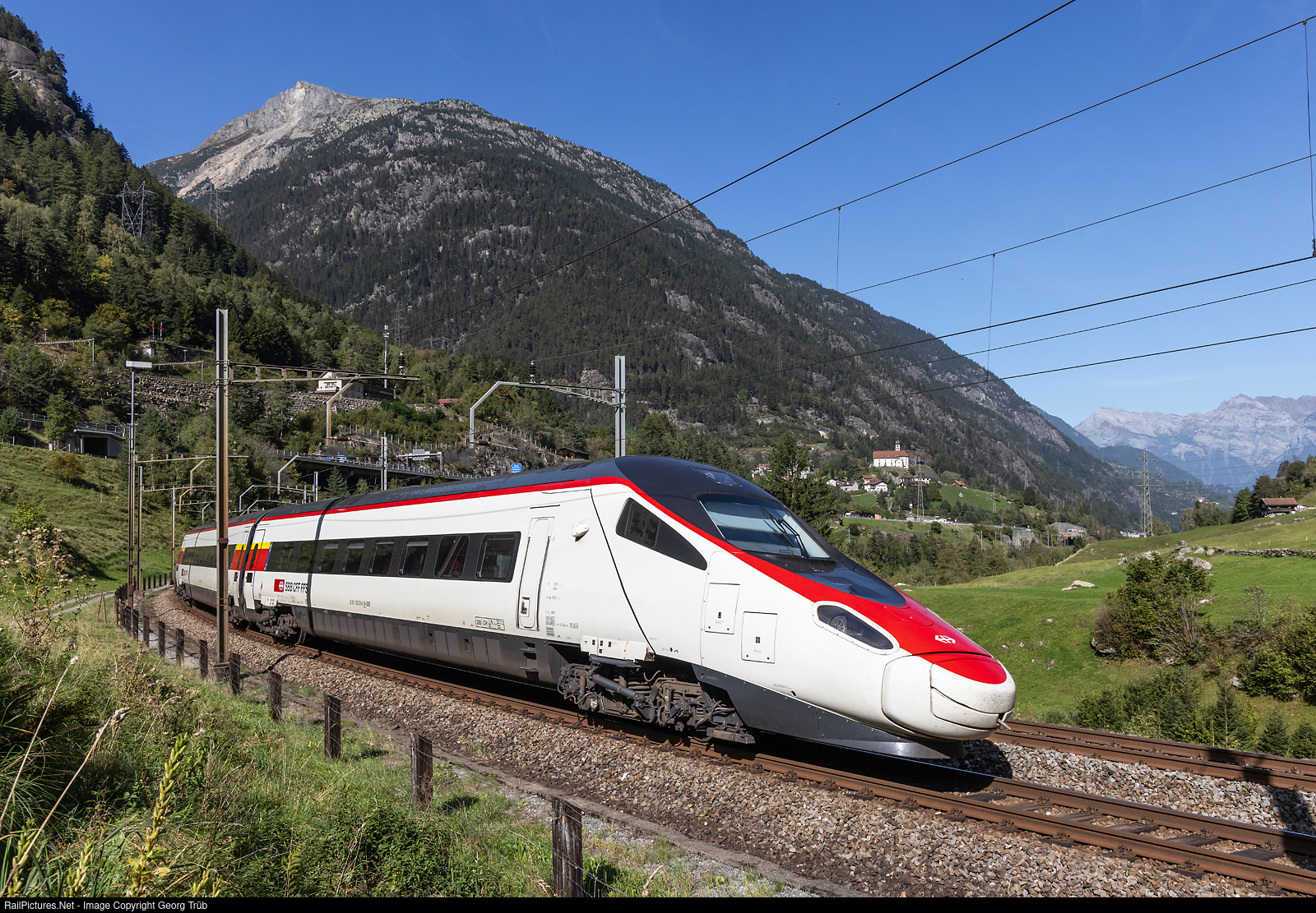 | Highspeed tilting train RABe 503 # 020 "Astoro" of the SBB, running light through the Wattinger curve on the Gotthard mountain line, as train 32302 from Chiasso to Basel freight yard, probably for maintenance. |