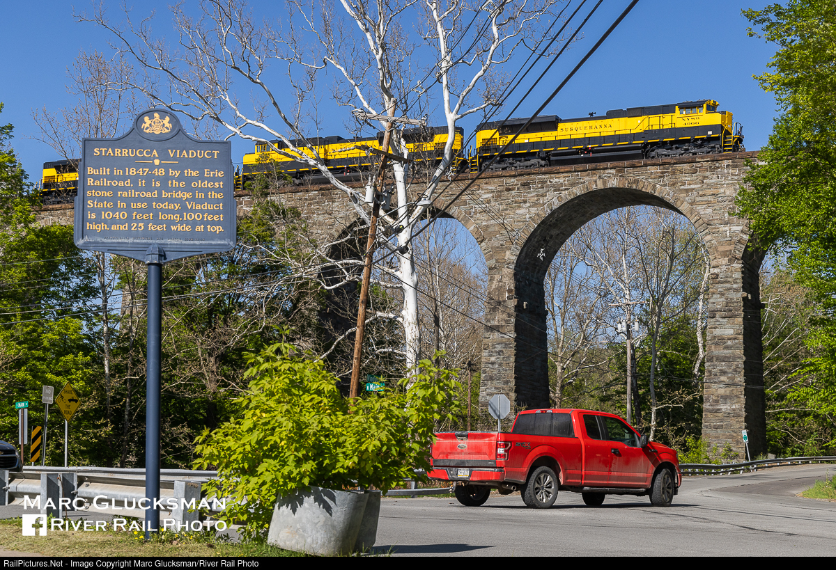 That Bridge, That Train, That Sign. A common phrase heard while chasing the New York, Susquehanna, and Western Railway SU-99 on that day, May 25, 2023, was "wow, what a great railroad to shoot, if only they ran in daylight more often." With an 0630 OD time for the crew, the chase was on across the Delaware Division as the train made great time from the recently repaired bridge in Millrift, Pennsylvania to Binghamton, New York and recrewed for points beyond. Starrucca Viaduct in Lanseboro, Pennsylvania was opened in 1848 by the Erie Railroad, and is the oldest active stone arch railroad bridge in use in Pennsylvania. Normally both the SU-99 and SU-100 pass through in darkness except for the long summer months, so this was a real treat. The first 3 matched SD70M-2s (4066, 4064, and 4060) were making their daylight debut here, leading SD40-2 3024 (Silver and maroon heritage) and healthy 72 car consist. While the wires have complicated the angle, the location is a classic Erie Railroad shot
