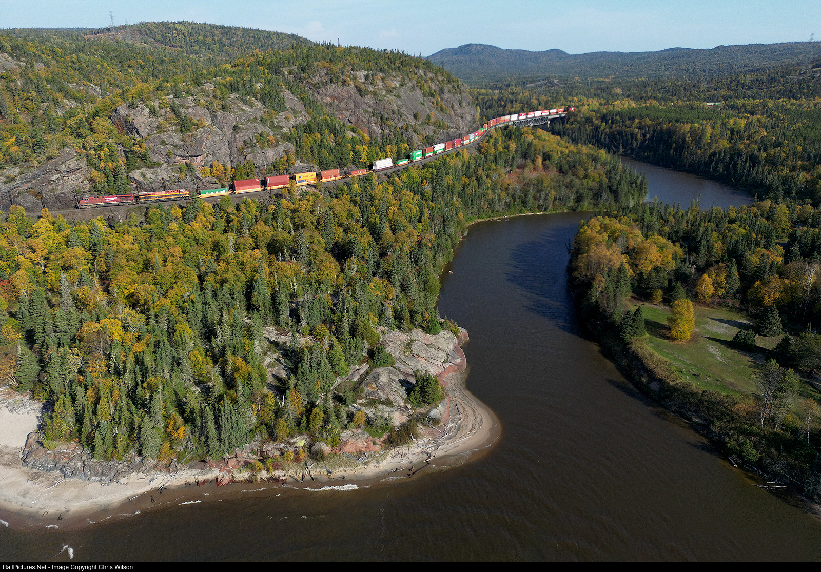 CPKC 113-01 heads across the Little Pic River trestle and along the mouth of the river as it flows into Lake Superior.