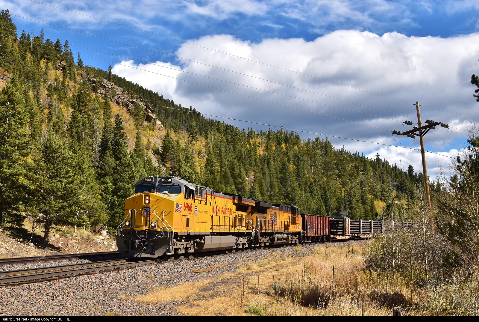 | UP 6968 (AC4400CW) leads a rail train through Tolland, Colorado, passing the golden aspen that line the valley.
