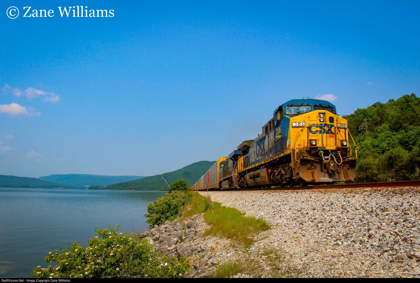 | As their GE motors echos across the valley, CSX 386 leads M580 by Nickajack Lake outside the small community of New Hope, Tennessee