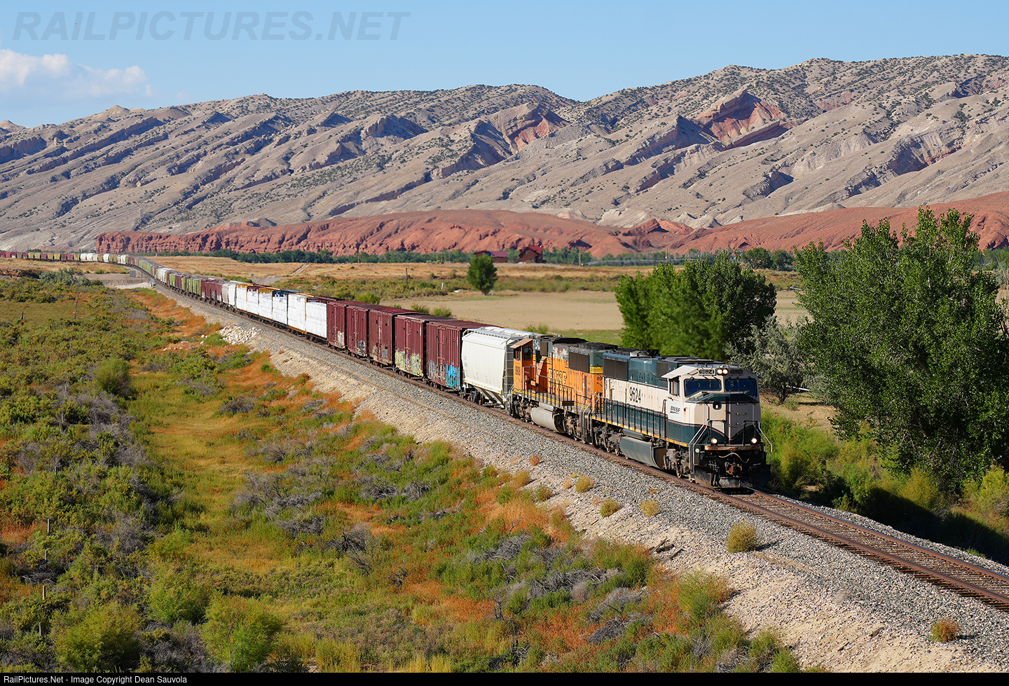 The local run north of Greybull, WY has assembled a formidable 96 car train by the time it returns to the terminal. These old coal motors are a good match to the task of this heavy train. The long local is laden with heavy loads from gypsum board to bentonite to stucco. All products of mines in the colorful hills of the northern Bighorn Basin.