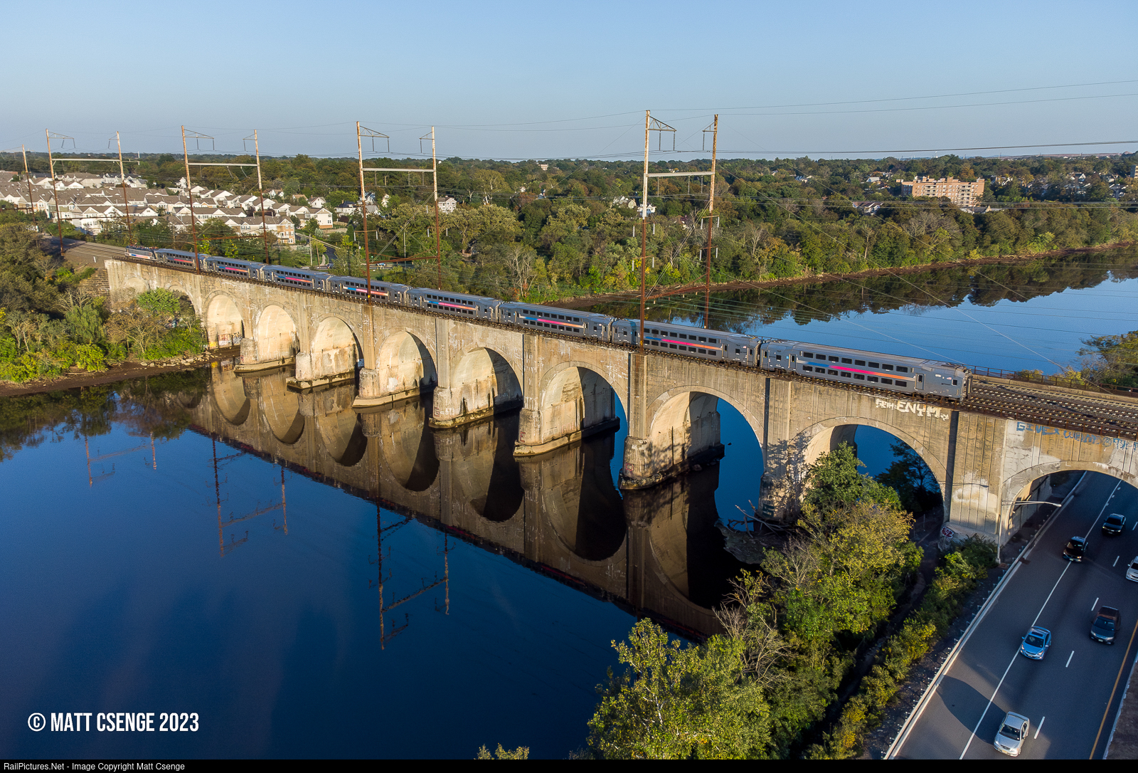 NJ Transit Northeast Corridor Line train 3949 is seen racing across the Raritan River, on its way to Trenton.