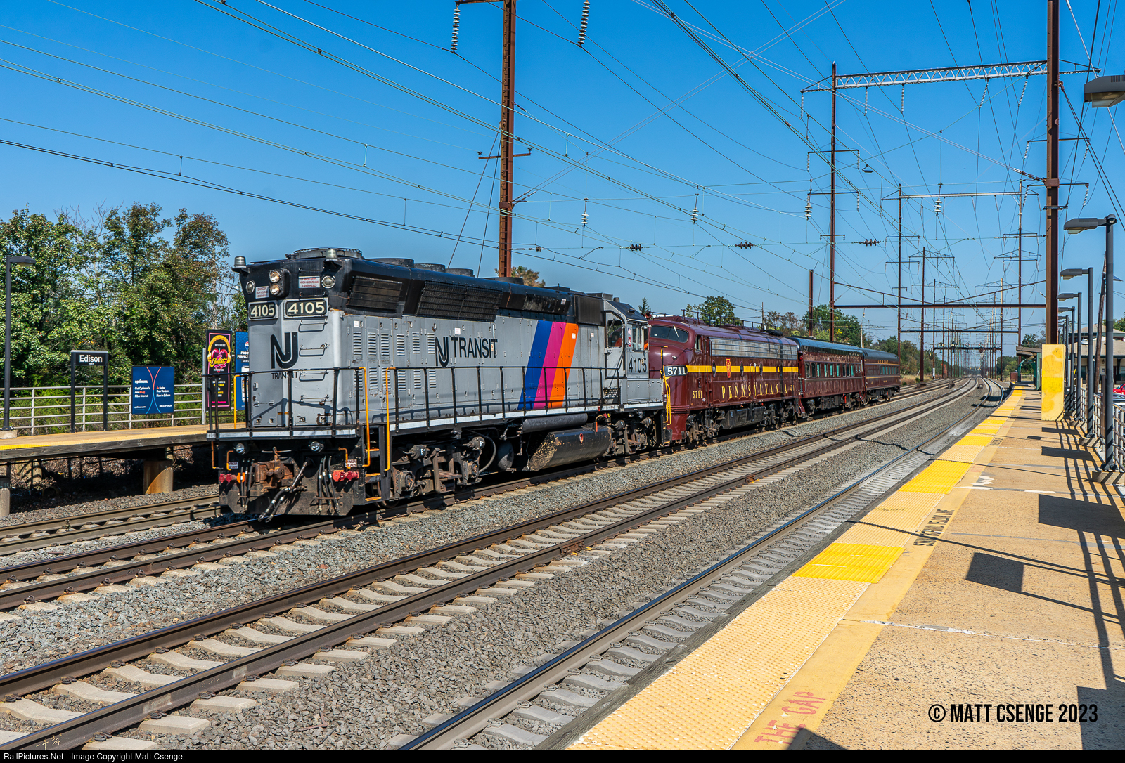 Running long-hood forward, NJ Transit GP40PH-2 no. 4105 (EMD, 1968) is seen racing through Edison Station with a non-revenue equipment move to return Juniata Terminal Co. equipment back to the company's facility in Philadelphia. Included in the consist are Pennsylvania Railroad E8 no. 5711, parlor car no. 1157 Warrior Ridge, and observation car no. 120. The Northeast Corridor is home rails for the Pennsy equipment, and seeing the Tuscan Red equipment under wire is quite a treat!