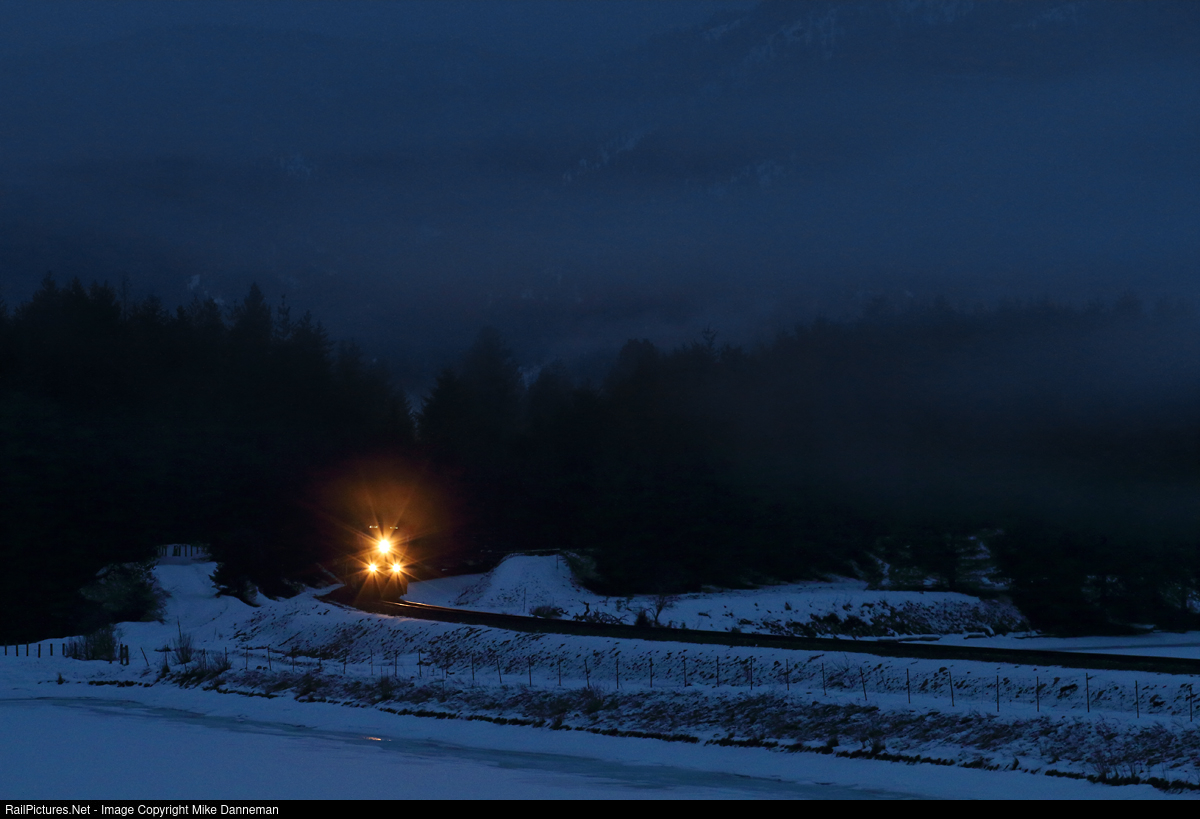 Another winter night is fast approaching as BNSF GE C44-9W No. 4948 leads an eastbound welded rail train toward Trout Creek, Montana. Fog is layering over the mountains and through the trees, with some briefly illuminated by No. 4948’s headlights as it rolls through the curve just east of milepost 57 on February 5, 2016.