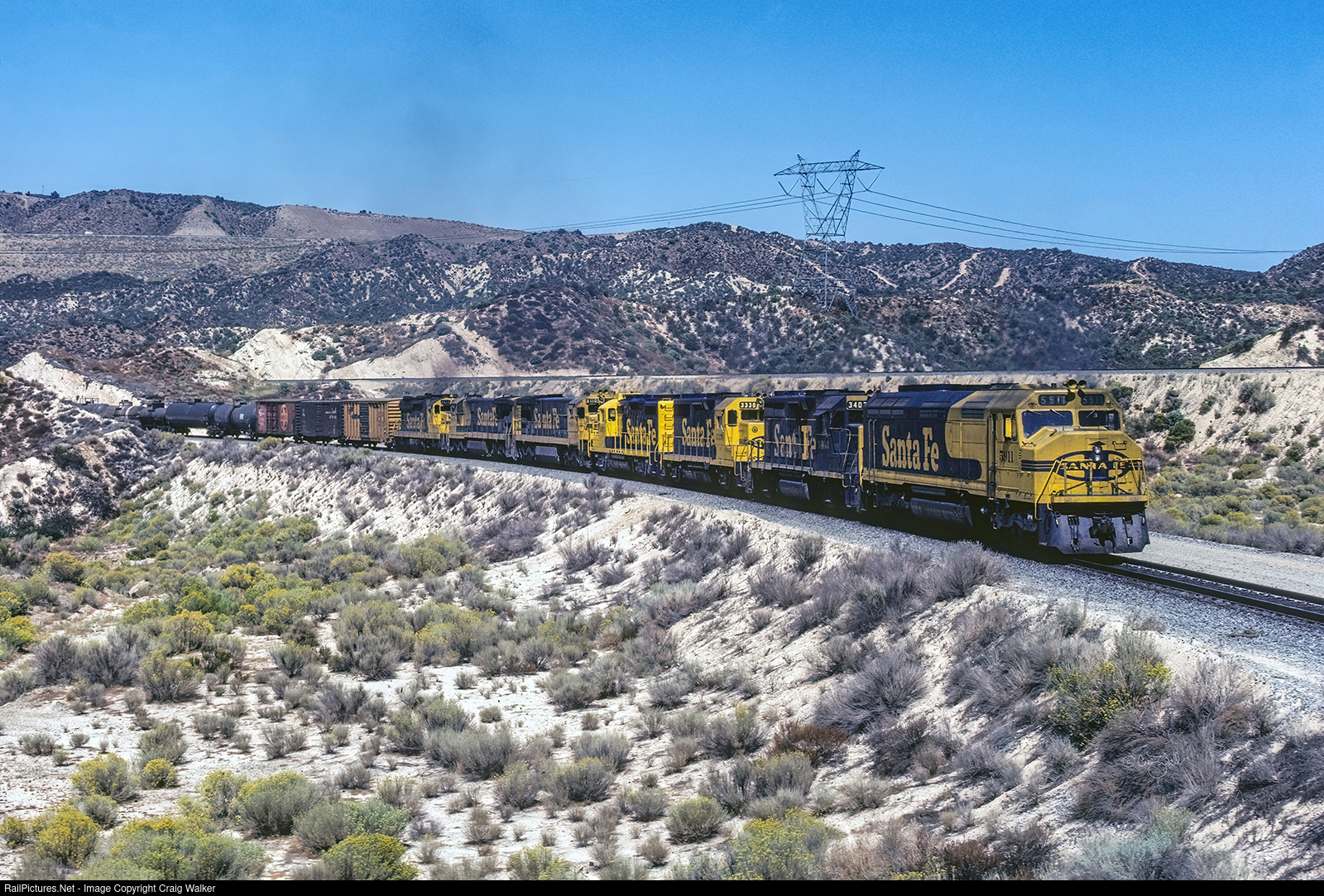 Grinding up the 3% grade on Cajon Pass' South Track, the original mainline and also the steeper of the two tracks, is an eastbound Atchison Topeka & Santa Fe Railway freight with an impressive set of power on the headend: ATSF F45 5911, GP35 3403, GP35 3330, GP20 3071, C30-7 8110, another C30-7 and an SD26. (Cajon Pass, California – October 5, 1980)