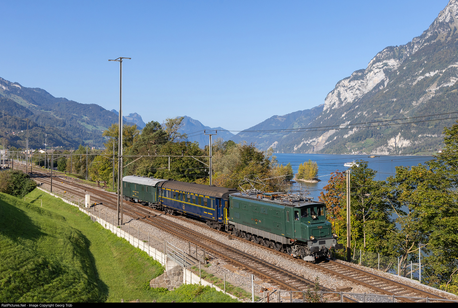 Birthday party train of association "Mikado 1244" is running empty along the Walensee in Unterterzen, with locomotive Ae 4/7 # 11026, built in 1933 by SLM and BBC with Buchli drive. The cars are former CIWL dining car WR # 2749 built 1929, privately owned and operated by association steam group Zürich, and baggage car D 51 85 92-43 # 014-5 of the Oensingen-Balsthal-Bahn, built 1937 for the SBB, based in Brugg AG and mainly used by steam group Zürich and Mikado 1244.
