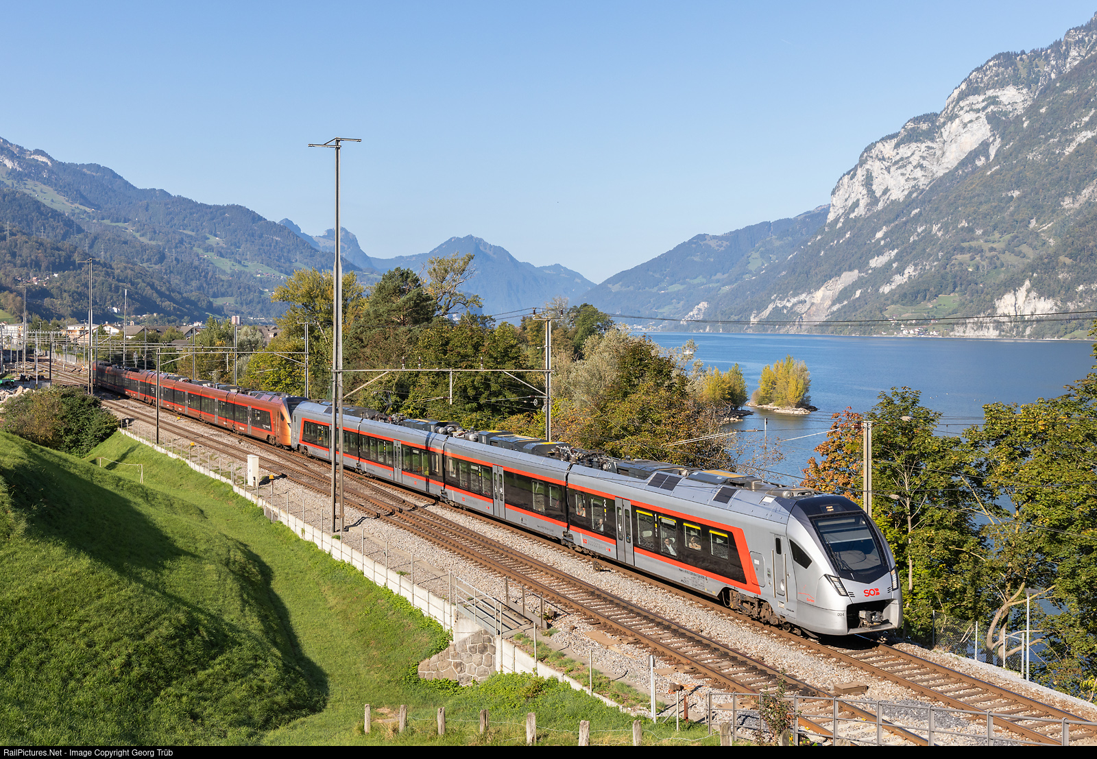 | "Flirt" RABe 526 # 004 and "Traverso" RABe 526 # 222/122 of the Südostbahn (SOB) in multiple control, are running the IR 2361 "Aare Linth" of the line IR35 from Bern via Olten-Zürich-Ziegelbrücke-Sargans to Chur through Unterterzen, with the Walensee and the Churfirsten in the background. |