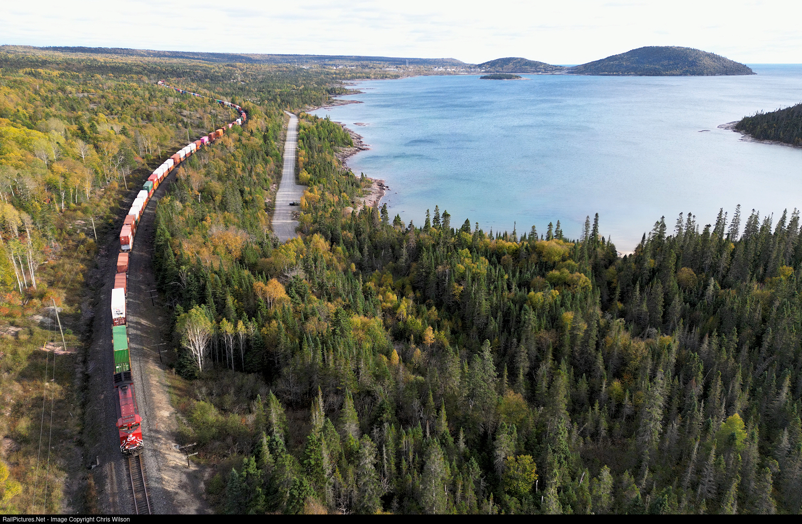 Toronto Yard, ON - Vancouver Coquitlam, BC stacks curve along Lake Superior west of Marathon at Carden Cove.