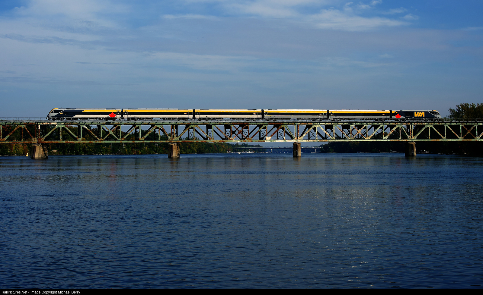 The cab car is leading as VIA 35 crosses the Richelieu River with a Siemens trainset.
