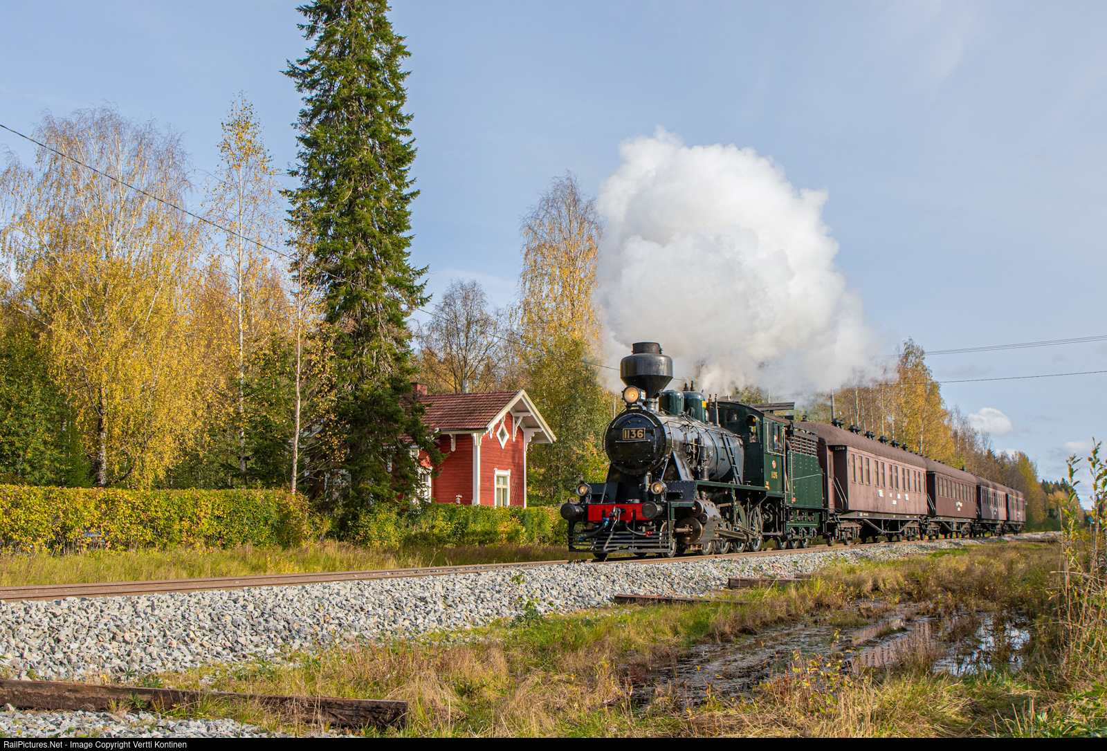 | Tk3 class wood burning steamer number 1136 on a photo run from Petäjävesi to Haapamäki. Here the train is passing an old railway workers building |