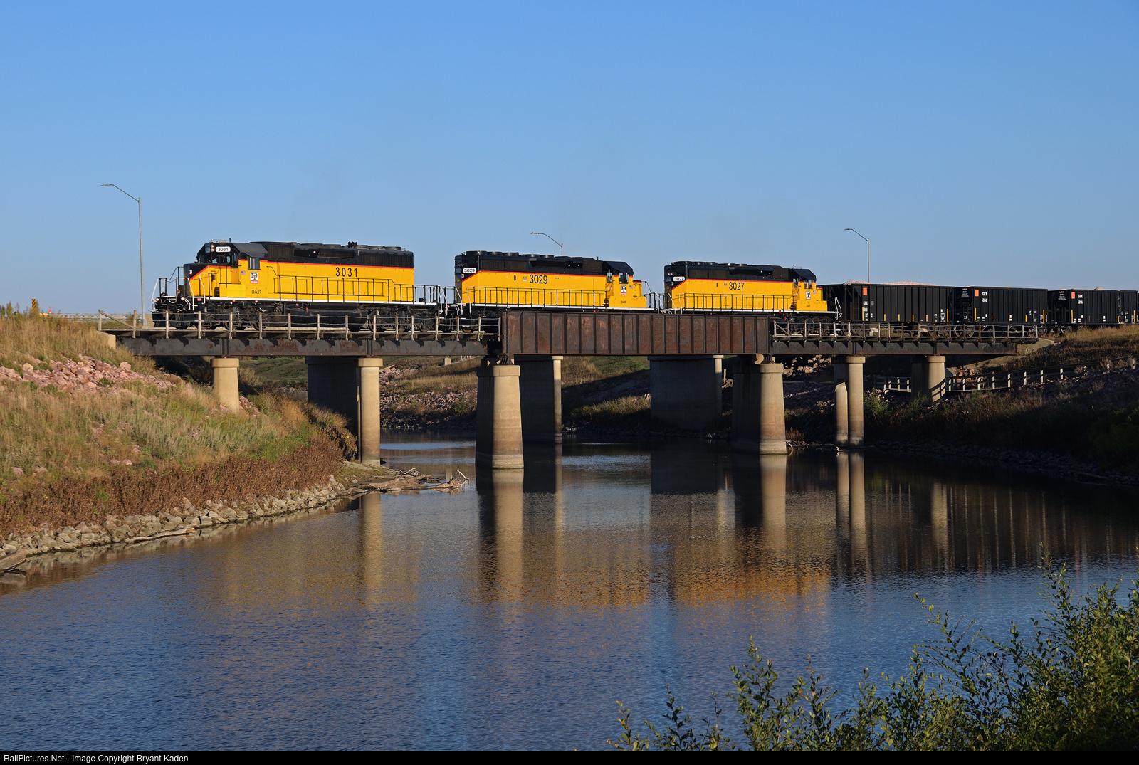 A southbound Dakota & Iowa train crosses the diversion canal for the Big Sioux River as it arrives in Sioux Falls behind three SD40-2s on a clear autumn morning.