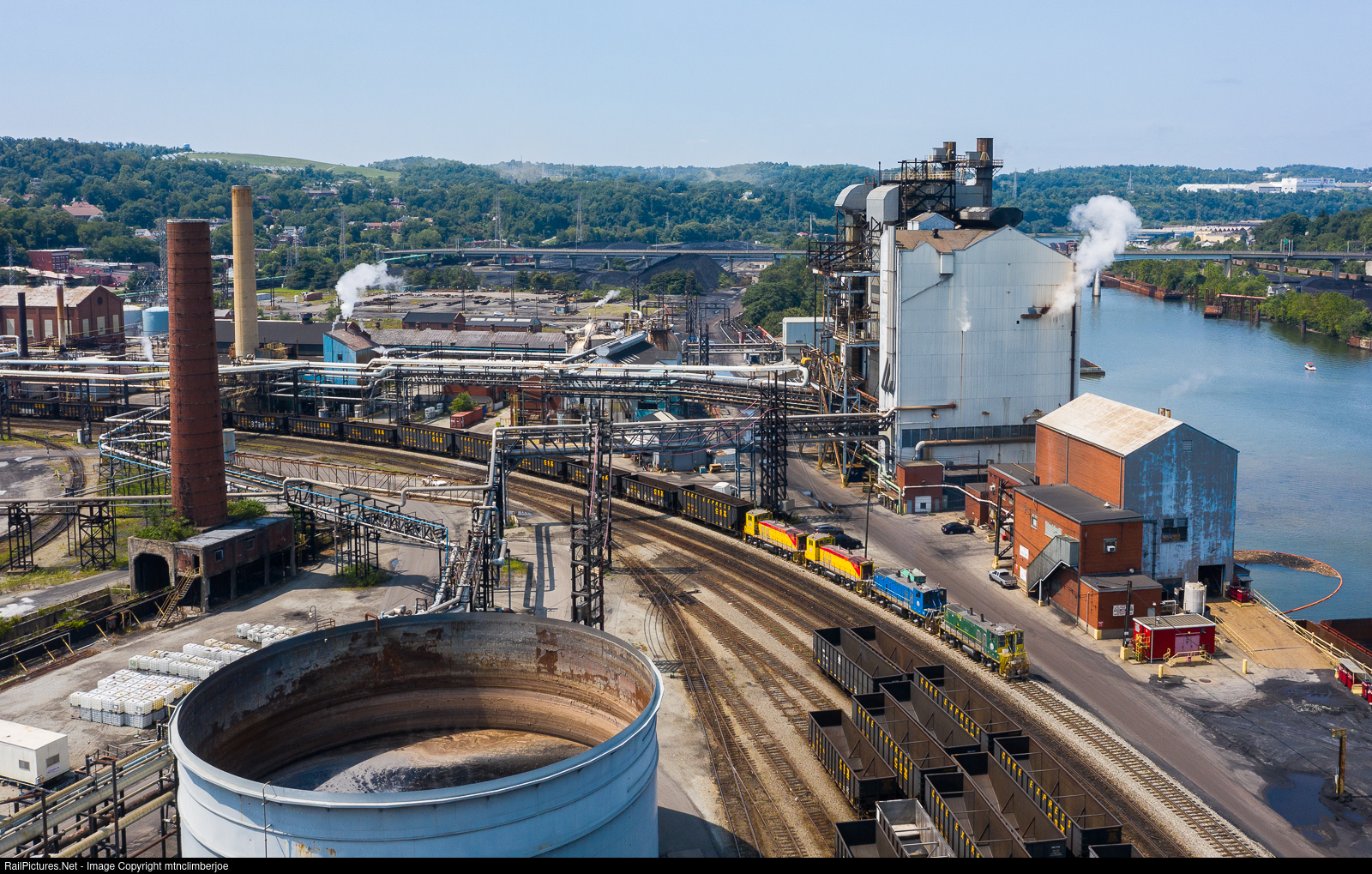 | A quartet of Union Railroad MP15's pull into the north end of the Clairton Coke Works plant in Clairton, Pennsylvania. The Job 66 crew has a train of empty CSX coke hoppers in tow which were picked up from CSX and will be loaded here before being taken back for interchange. |