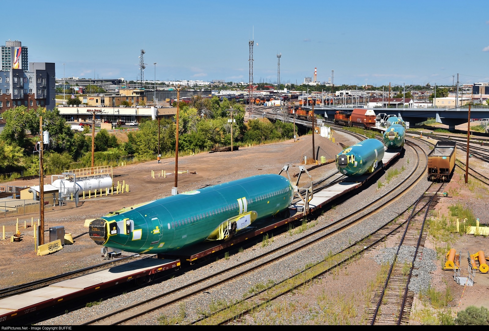 Four Boeing 737 aircraft fuselages fly low through Denver in tight formation.