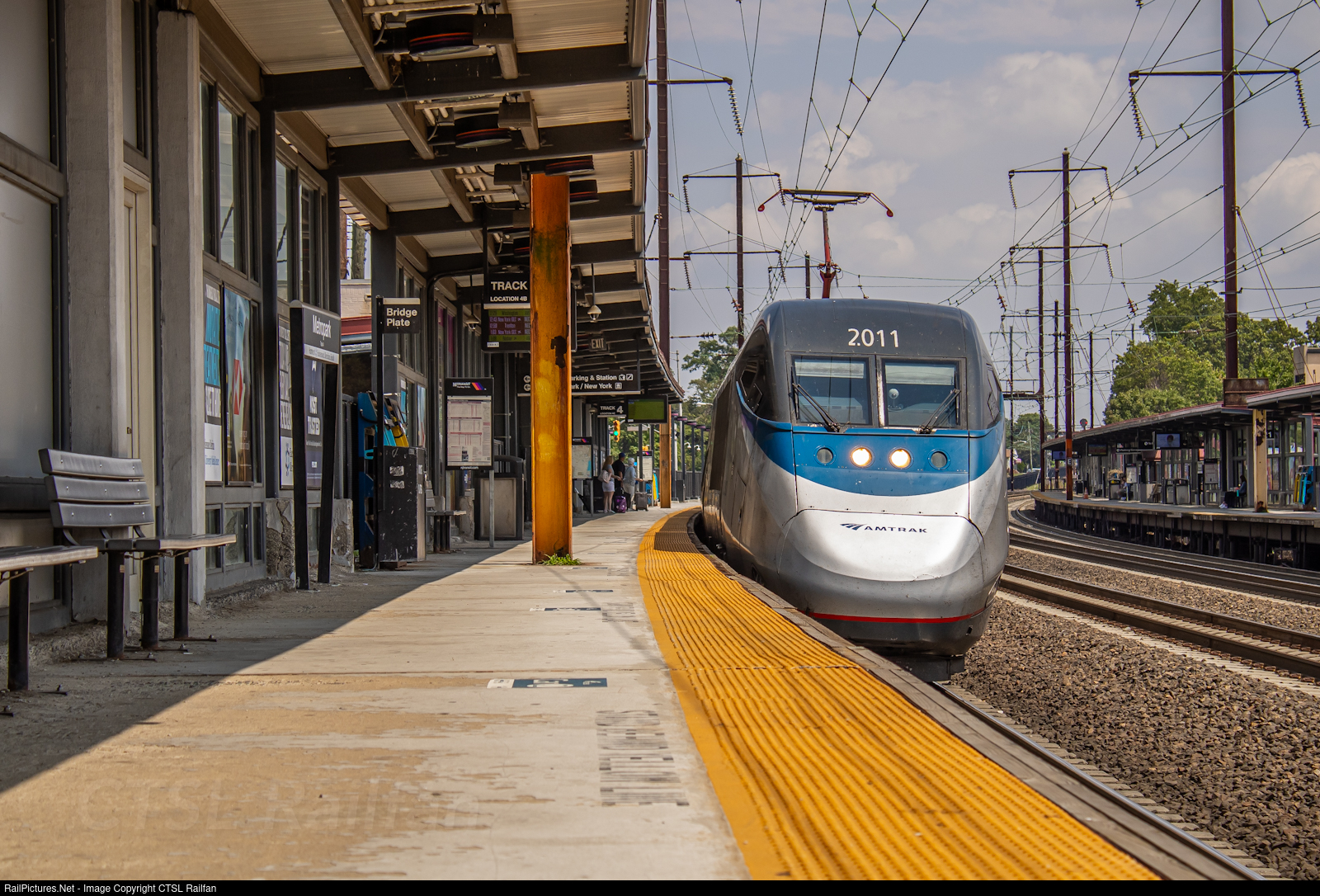 | An Amtrak Acela makes a quick stop at Metropark Station, before continuing on down to Washington, DC. |