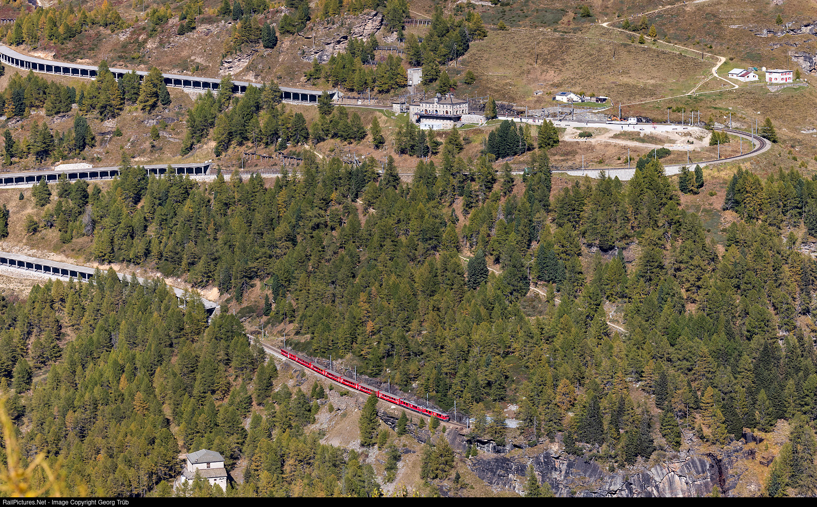 October 11, 2023 was a day of very long delays on the Bernina line. This was caused by a complete line interruption between Cinuos-chel-Brail and S-canf as well as a locomotive defect on two ABe 4/4 railcars the day before. The regional train 1633 from St.Moritz to Tirano is about 30 minutes late on its way between Alp Grüm and Stablini, hauled by the two ABe 4/4 (Tw III) # 51 and # 52. The line runs with 7.0 % gradient in loops on the valley slope with longer sections in galleries. The train is about to enter the Stablini tunnel. The railcars were actually assigned to traction of the BERNINA EXPRESS PE 973, which later came hauled by an "Allegra" ABe 8/12, also massively delayed.