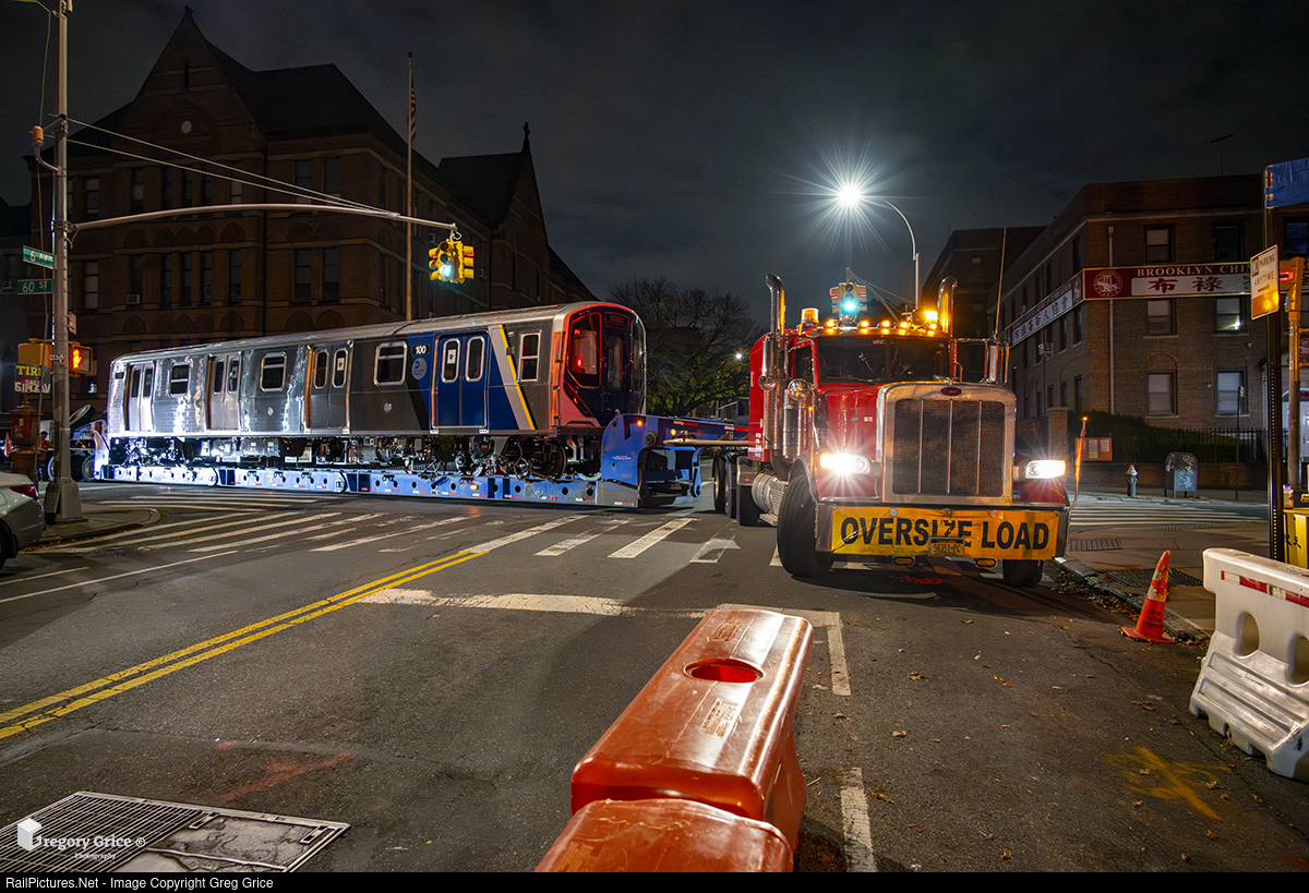 During the early morning hours of October 11th, 2023, the first Kawasaki built MTA Staten Island Railway R211S, SIR 100, makes its way through the dark streets of Brooklyn, NY (60th Street & 6th Avenue) as it heads to its permanent home of Staten Island by way of MRI USA Inc flatbed truck. The 5-car R211S pilot set (SIR 100-104) performed several initial tests on the New York City Transit system and once on the island, will perform similar tests before entering revenue service.