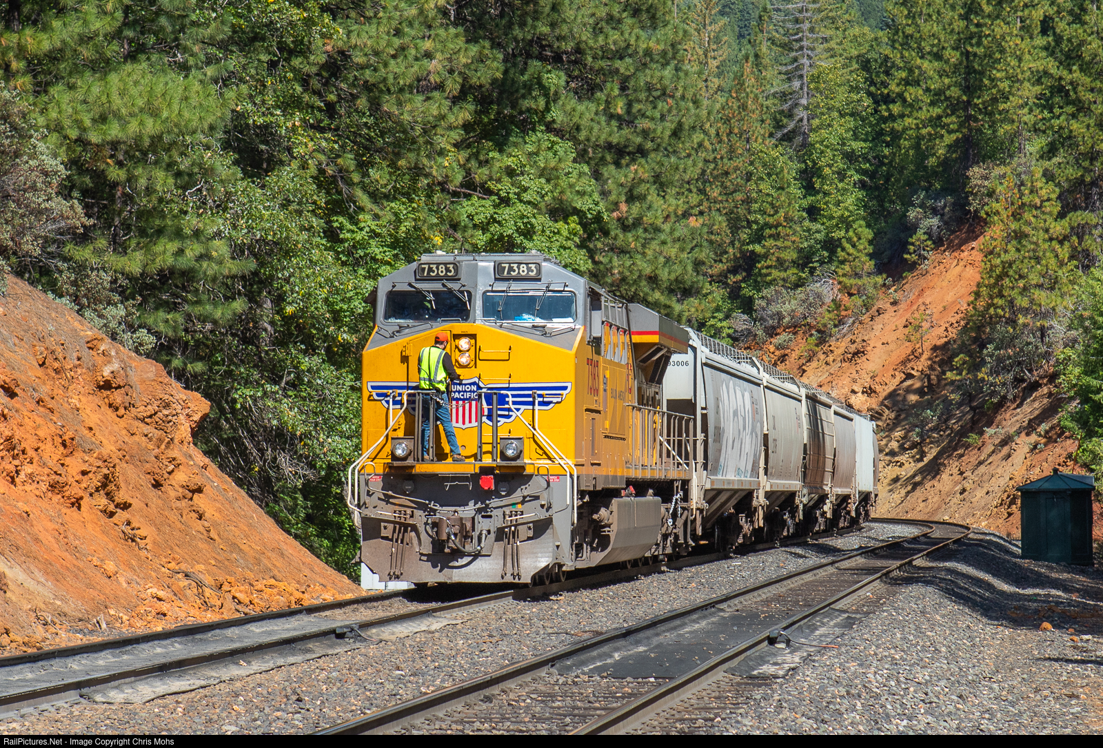 | After stopping for an additional crewman, eastbound Union Pacific no 7383 is set to Continue up the Roseville Sub to Donner Pass. |