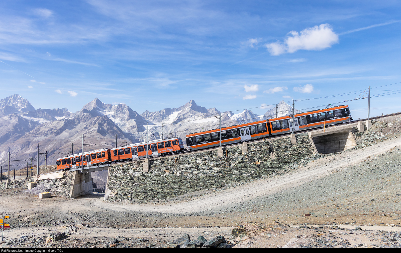 | Cogwheel railcars Bhe 4/8 # 3052 and POLARIS Bhe 4/6 # 3092 of the Gornergrat Bahn (GGB) in multiple control left the top station of Gornergrat shortly for the journey to Zermatt. |