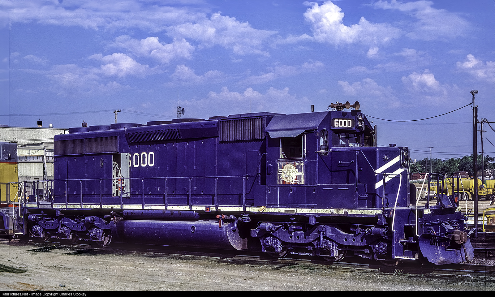 | FORT WORTH TX May 26 1985 — Missouri Pacific SD40-2 6000 is tied down and awaiting an assignment. EMD built the unit (b/n 756145-01) in July 1976. On July 24 1986 it was renumbered to UP 3900. On Feb 1 1994 it was retired and returned to the owner/lessor and was operated in national lease service as GATX 900. My photo.