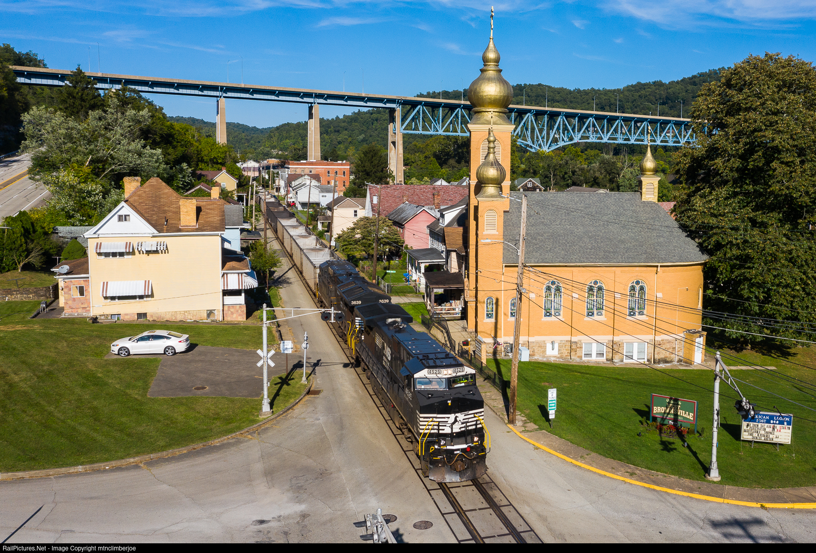 Norfolk Southern mine run N23 slowly makes its way through the street running on Main Street in West Brownsville, Pennsylvania and rolls past the Holy Resurrection Orthodox Church at the end of the street. This a a combined double empty coal train running with 2x2 distributed power for its trip to the Bailey Mine, where the trains will be split for loading.