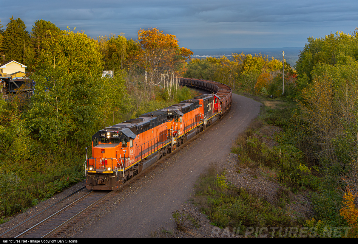 | Pumpkins Climb Spirit Mountain: BLE 906 leads fellow Bessemer SD40T-3 #904 and CN/IC SD40-3 #6255 as they lug ore empties up Spirit Mountain from Dock 6 in Duluth to Proctor Yard. Stormy skies and a pinch of October foliage really helped to make this shot. |