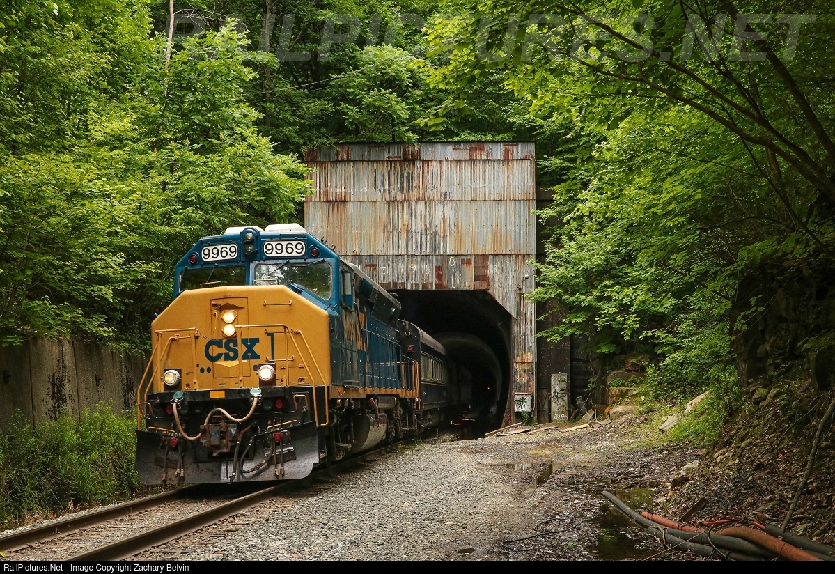 | The CSX Geometry Train blasts out of the 4.5mile Hoosac Tunnel at track speed, led by the one-of-a-kind CSXT 9969, a former MARC GP40WH-2. |