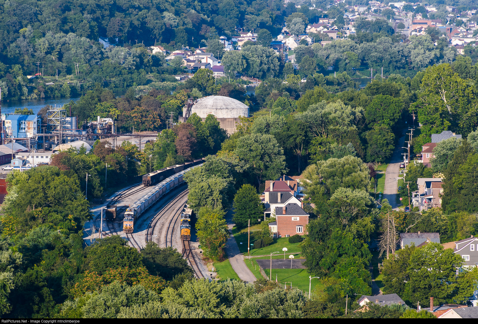 A Union Pacific AC4400 leads CSX sand train B454 as it arrives at CSX's Newell Yard in Newell, Pennsylvania and pulls in alongside empty coal train R128. These trains will both wait here for crews to take them down to the NS Loveridge Secondary to head towards Grafton, West Virginia.