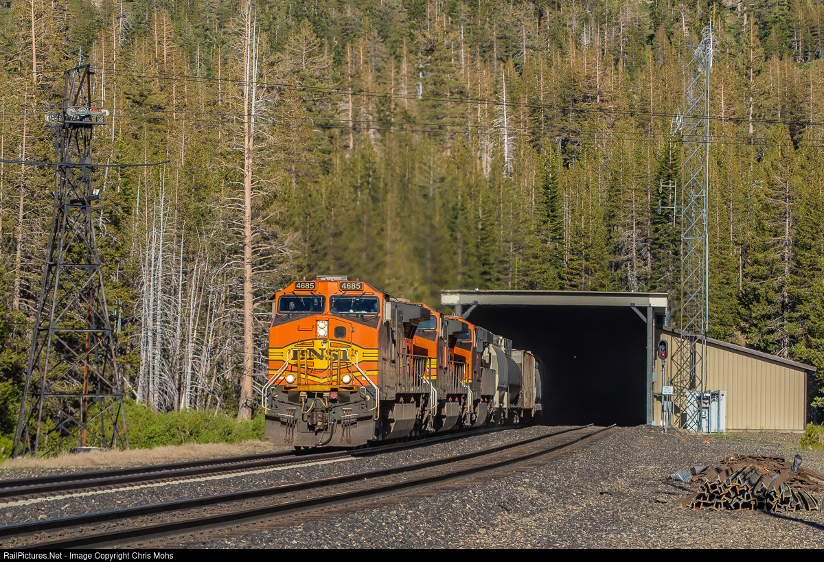 | Westbound BNSF C44-9W no. 4685 exits the 10365 ft Tunnel 41, The Big Hole, at the Summit of Donner Pass. Some of the equipment for Sugar Bowl Ski Area can be seen at the mouth of the tunnel . |