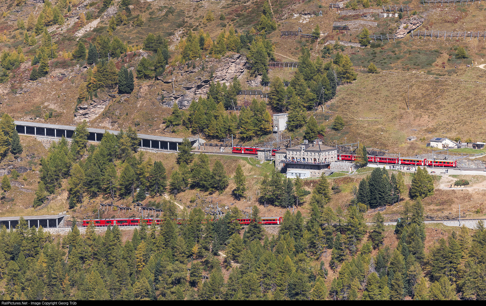 | Trains 4629 and 4648 of the Rhaetian Railway had a crossing on Alp Grüm (2091 meter a.s.l.) on the Bernina line. Both trains are pulled by "Allegra" ABe 8/12 railcars. This day, most trains on this line had delays due to a shortage of railcars. Both trains are late and the crossing should be in Stablini according the timetable. |