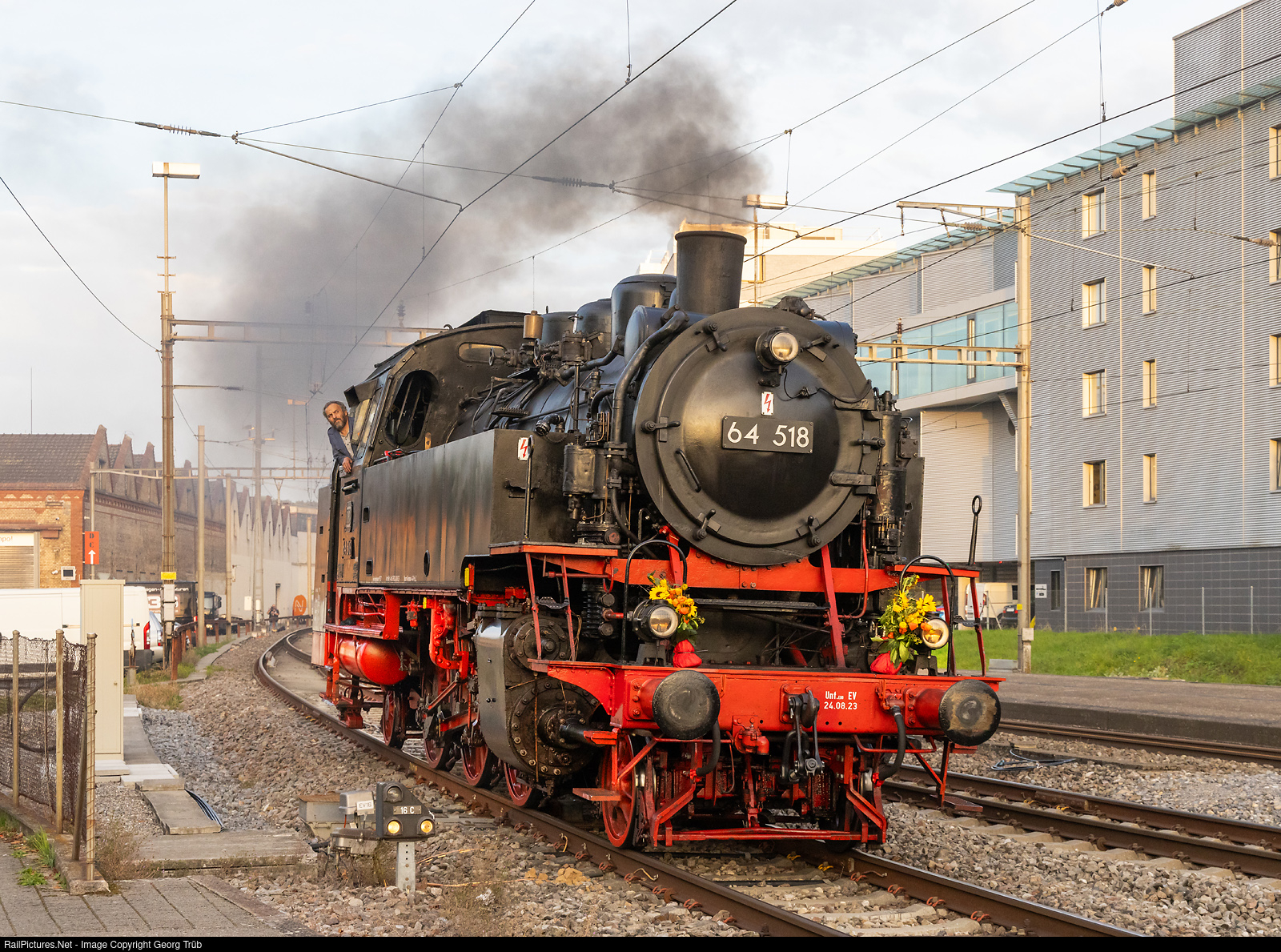 | The 2-6-2 T steamlocomotive 64 # 518 of the Eurovapor is rounding her train in Kloten. The locomotive was built in 1940 by Jung/Jungenthal/Germany for the Deutsche Reichsbahn and was withdrawn by the Deutsche Bundesbahn in 1972 in Tübingen. Since then she was in Huttwil, but stabled since 2014. Now operational again and on the way to the new home base in Würzburg/Germany. |