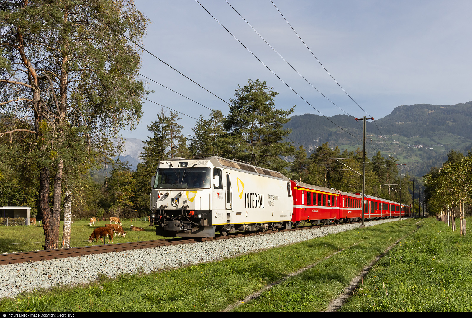 | Ge 4/4 III # 642 of the Rhaetian Railway in the "integral" publicity paint scheme pulls the Interregio 1129 from Chur over the Albula line to St.Moritz, between Rodels-Realta and Cazis. |