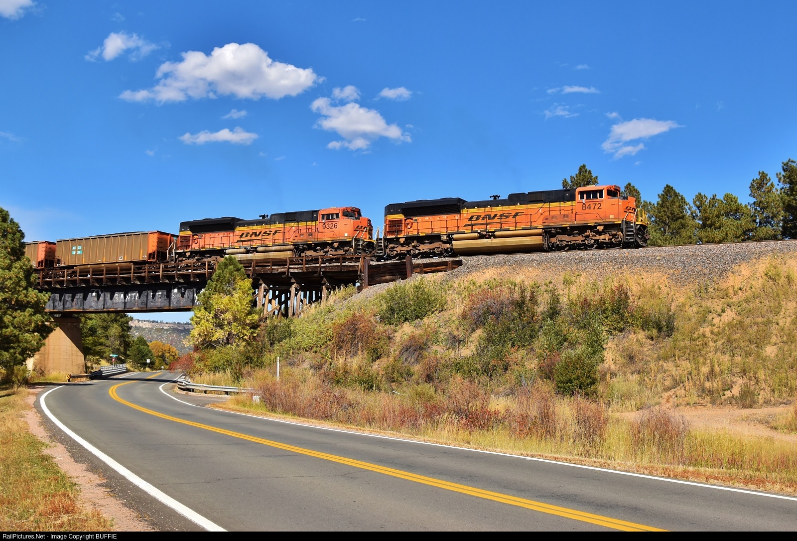 BNSF 8472 (SD70ACe) leads a loaded coal train over the Santa Fe Bridge in Larkspur, Colorado.
