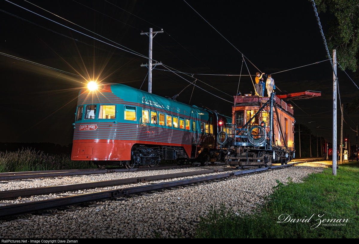 Chicago North Shore & Milwaukee's beautiful "Electroliner" flies past track crews inspecting the overhead wire at during a night photo session at the Illinois Railway Museum.