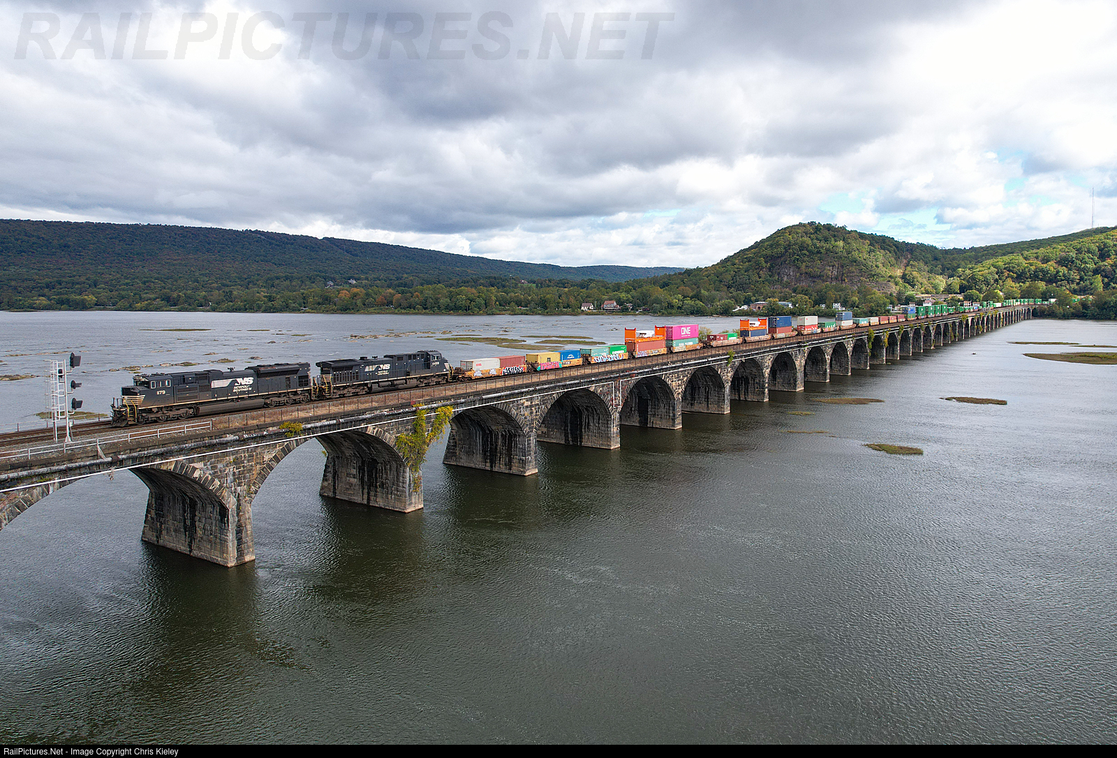 NS SD70ACe 1179 leads train 257 across the Rockville Bridge with some unusual container loads in the consist.