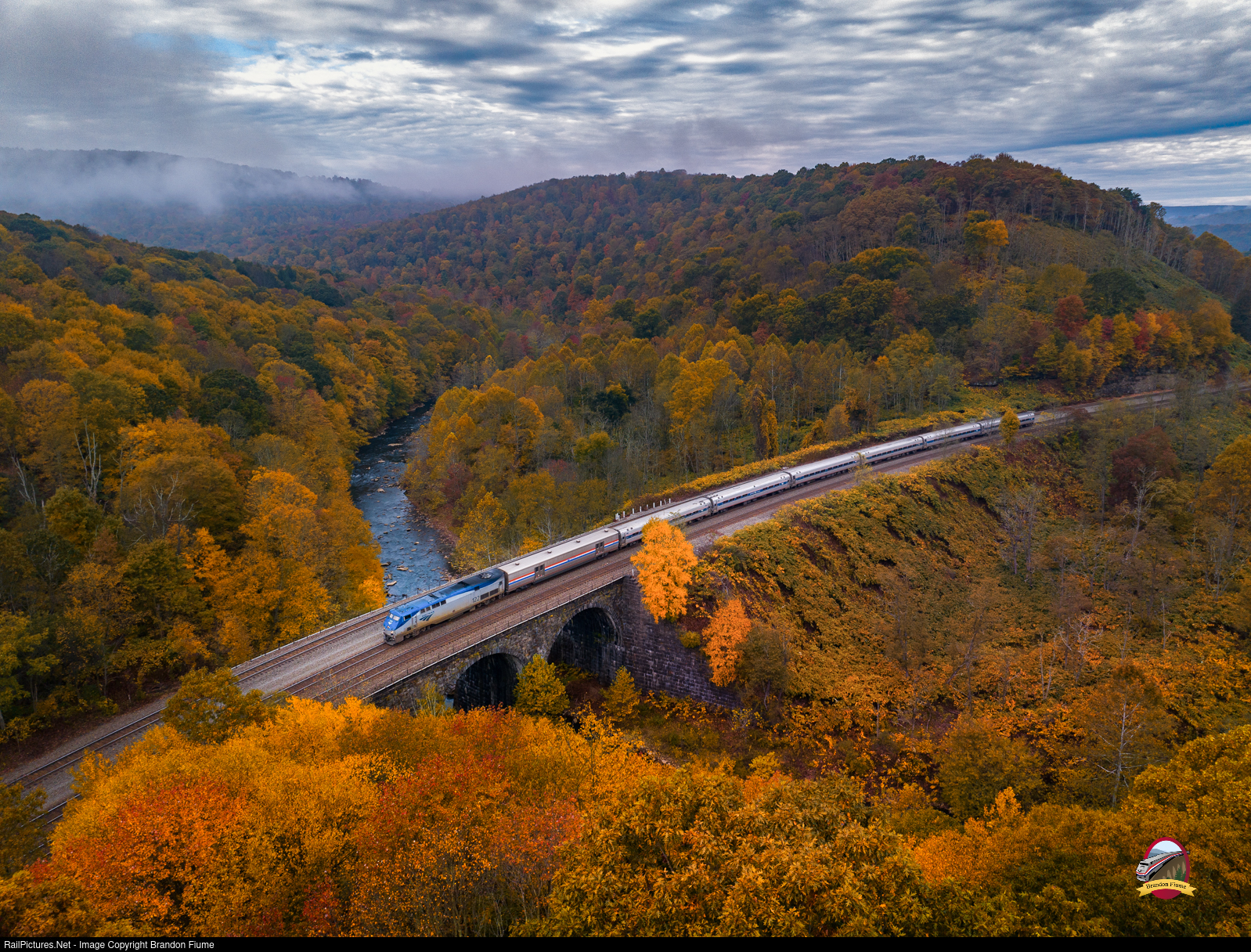 The Amtrak Pennsylvanian heads east over the "Big Viaduct" between Mineral Point and South Fork. The stunning autumn colors provide a scenic ride for passengers through some of the more remote sections of the railroad.