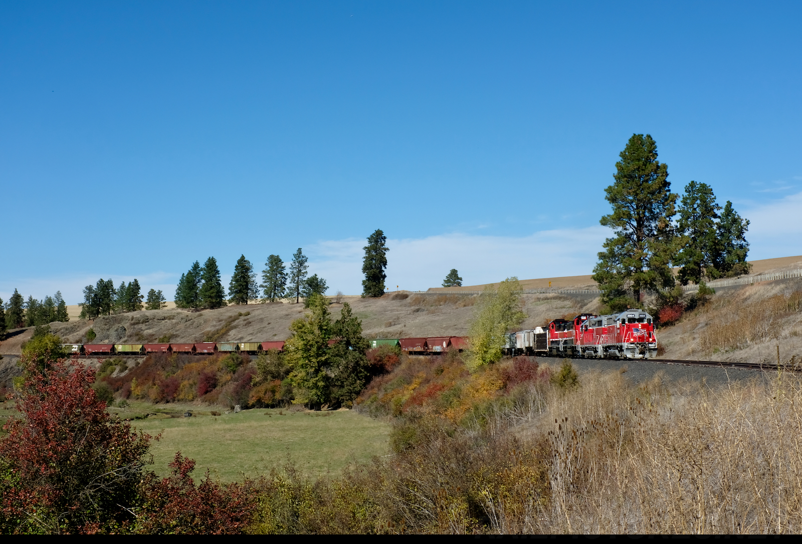 | SSP's entire roster—a pair of conventional GP39Ms and the ex-Kennecott Copper high-cabs—descend the grade down into the Palouse River valley. This is the longest train I've seen on this part of the line in a looonnng time: twenty-some-odd empty hoppers for the elevators in Palouse and a centerbeam loaded with fresh ties for track rehab. |