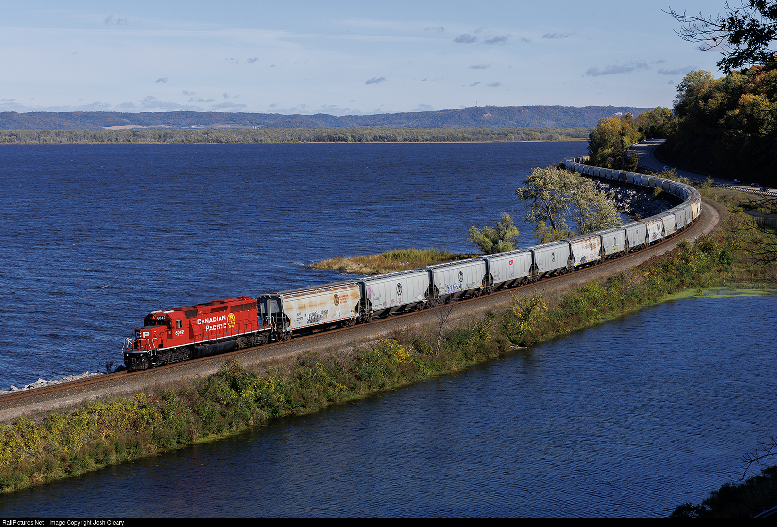 CPKC I70, the Wabasha Patrol, snakes along the Mississippi River with an overhauled SD40-2 and 52 grain loads for Red Wing.