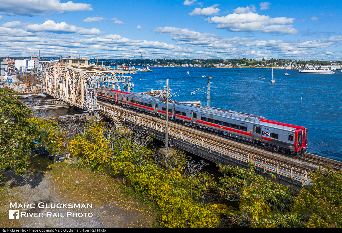 Sticker Cars. On the afternoon of Sunday October 8, 2023, Kawasaki built M8 9365 led Shore Line East Train 3645, seen crossing Shaw's Cove in New London, Connecticut on the way to New Haven, Connecticut. Of the more than 500 M8s purchased by MTA Metro-North Railroad and the Connecticut Department of Transportation, generally 24 are assigned to Shore Line East Service since May of 2022. These cars have their third rail shoes removed for clearance purposes and recently have had a "CT Rail - Shore Line East" sticker placed over the Metro-North logo.