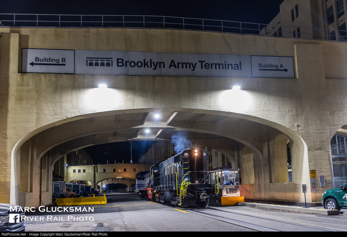 Brooklyn Army Alco Terminal. Early on the morning of Tuesday, October 17, 2023, NYNJ Rail headed out of their yard and up 1st Avenue in Brooklyn, New York. For this move, Knoxville Locomotive Works built NYNJ 5101 (KLW SE10B) was paired with KLWX 253 (MK TE-47-4E, ex-MRS 253, S4m, née MRS 208, S2, Alco). The 253 has been on an extended assignment to the New York City side of the operation and is normally the spare power kept on the New Jersey side of New York Harbor. The power set paused for a moment at the gate for the Brooklyn Army Terminal before beginning their day.