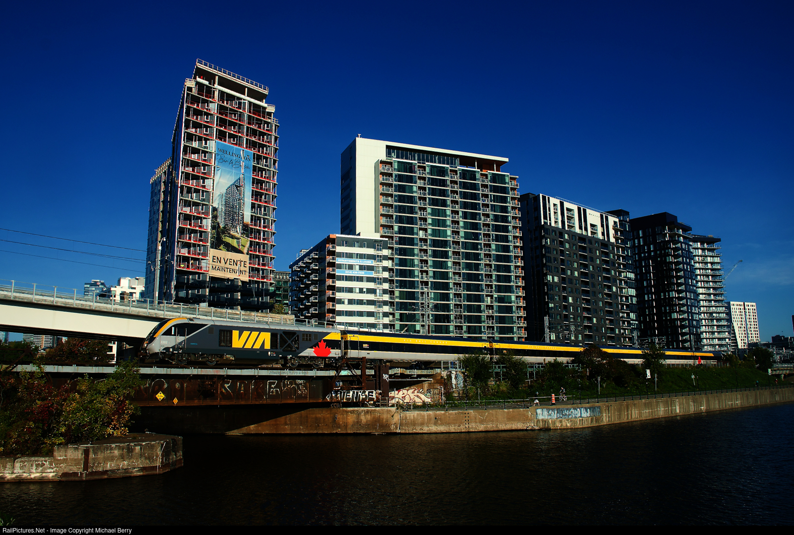 VIA 33 from Quebec City has a Siemens trainset as it passes the Peel Basin. Out of sight behind the Charger unit on the rear end is Wellington Tower.
