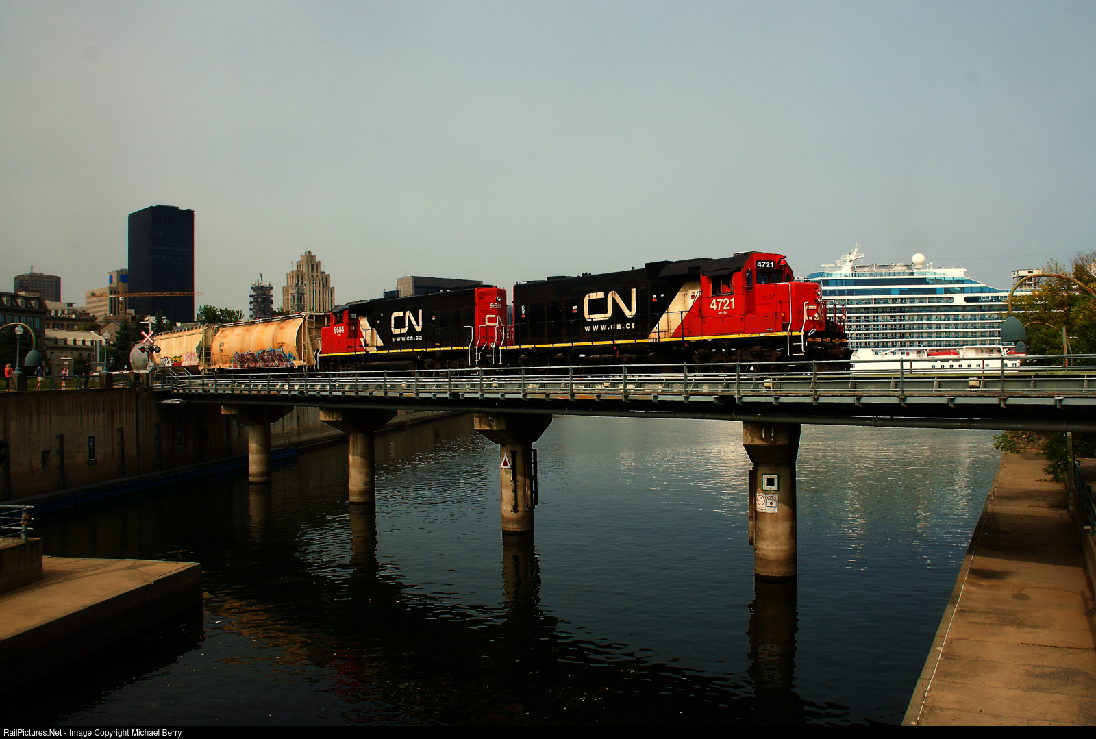 A cruise ship is docked in the Port of Montreal as CN 500 leaves the port with CN 4721 & CN 9584 for power.