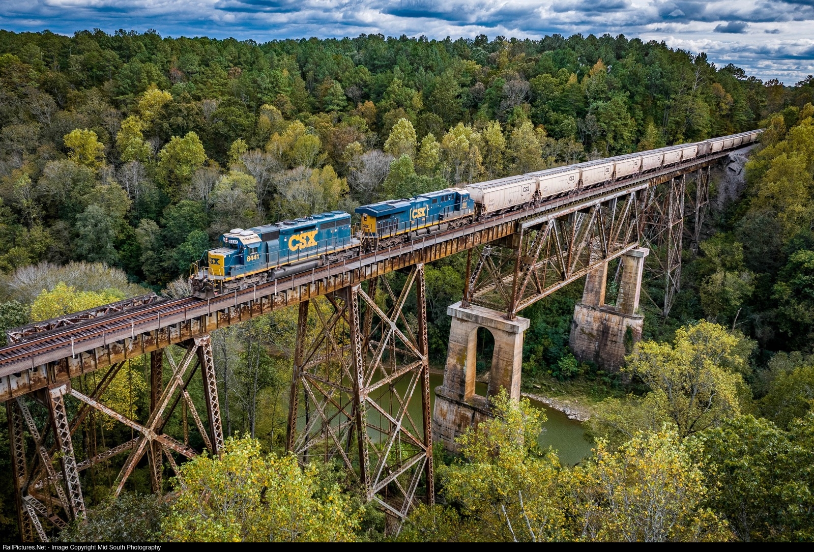 CSXT 8441 leading an empty company grain train across Locust Fork trestle.